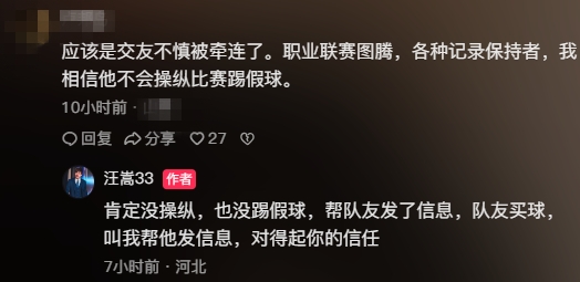 2025-03-13 12:33:01汪嵩再回評論:肯定沒操縱也沒踢假球,隊友買球叫我幫他發信息