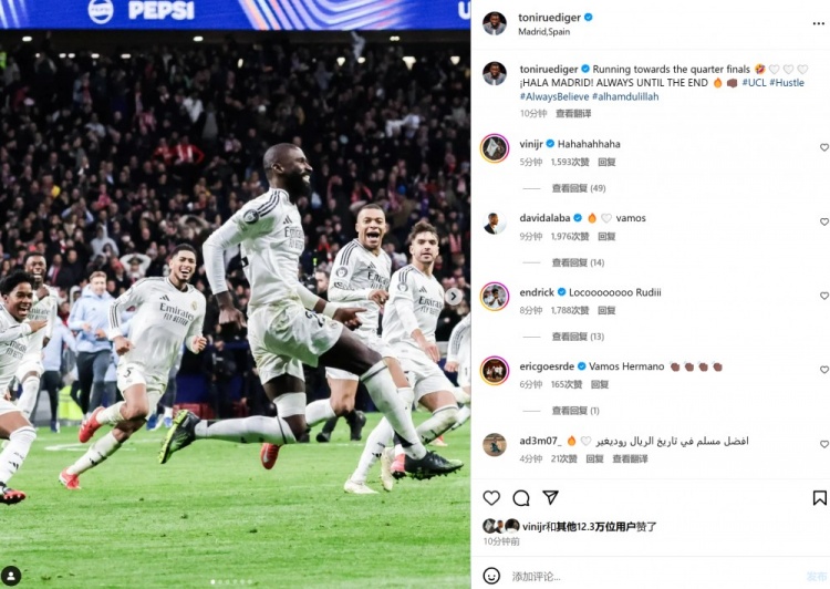 2025-03-13 12:38:02打進致勝點球,呂迪格社媒曬慶祝照:永遠堅持到最后一刻!
