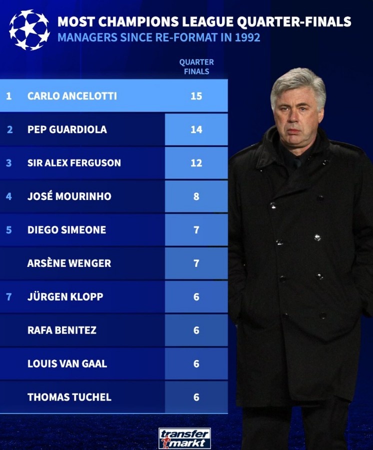 2025-03-13 12:38:10歐冠改制后主帥晉級8強次數(shù)榜:安切洛蒂15次居首,瓜帥次席