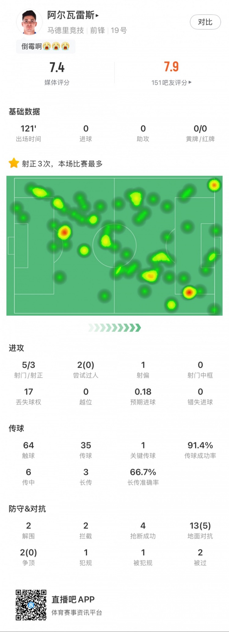 2025-03-13 12:40:57阿爾瓦雷斯本場數據:點球大戰丟點,5次射門3次射正,4次搶斷