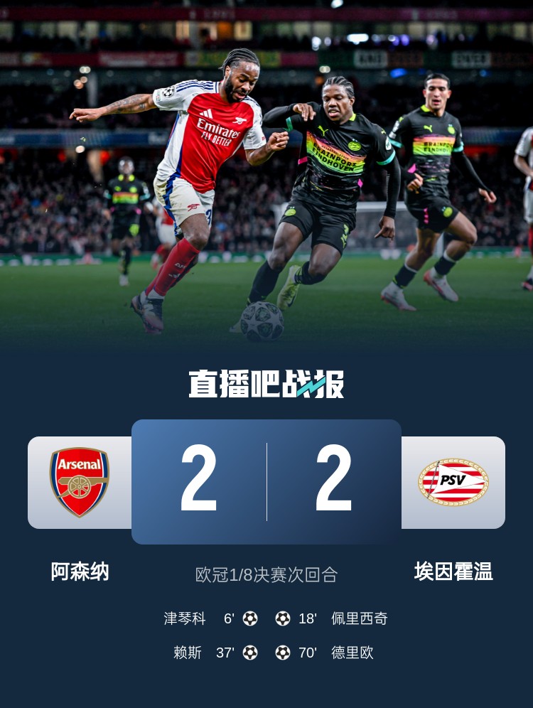 歐冠1/8決賽次回合,阿森納2-2戰平埃因霍溫,總比分9-3晉級八強。上半場,津琴科破門,佩里西奇扳平,賴斯頭球建功,斯特林送出2次助攻&錯失1次單刀球機會;下半場,德里歐挑射破門。