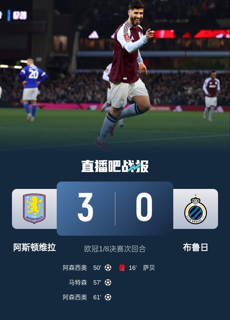 歐冠1/8決賽次回合,維拉3-0擊敗布魯日,總比分6-1晉級歐冠8強。上半場,大馬丁精準長傳找到拉什福德,后者制造直紅;下半場,阿森西奧替補登場雙響,另有一次中柱,拉什福德貢獻1助攻,馬特森打進1球。