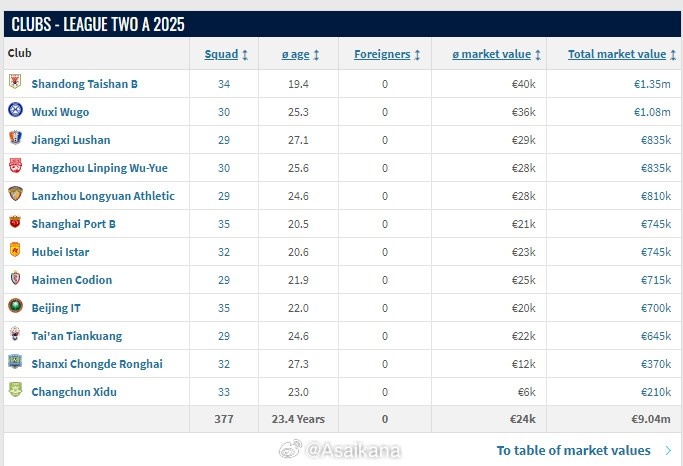 2025-03-14 11:41:03中乙球隊身價更新:山東泰山B隊以135萬歐元排在第一