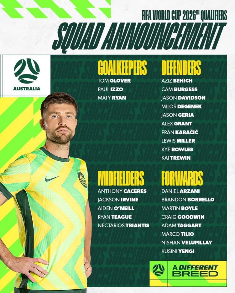 2025-03-14 11:41:15澳大利亞隊世預(yù)賽名單:“人民球王”古德溫領(lǐng)銜,3月25號對國足
