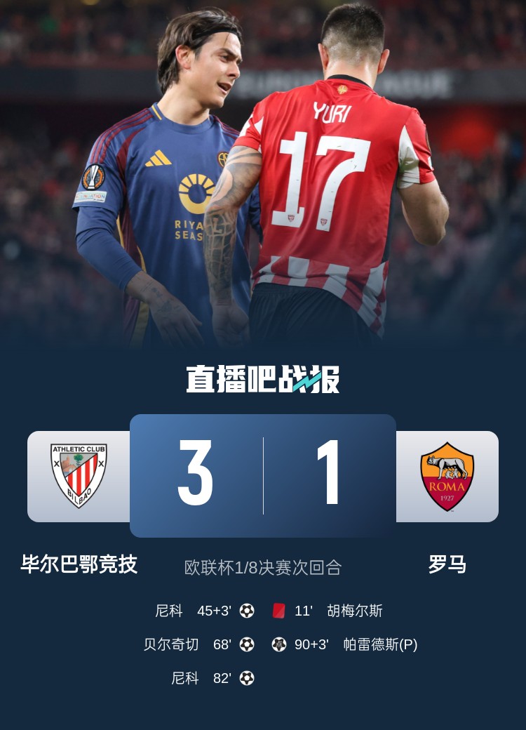 歐聯16強次回合,羅馬1-3不敵畢巴,羅馬總比分3-4遭逆轉。胡梅爾斯11分鐘染紅。