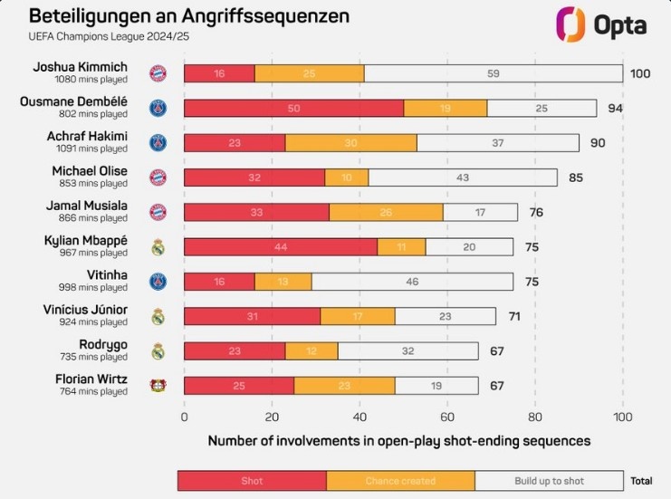 2025-03-14 11:44:01基米希歐冠單賽季4次助攻平個人紀錄,11次創造重大機會同期最多
