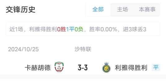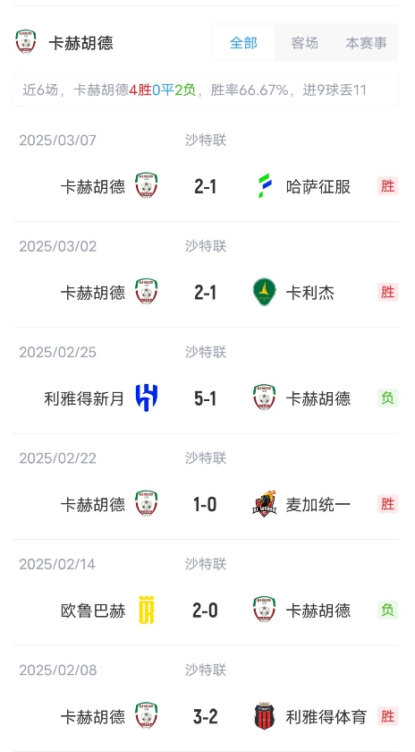 目前利雅得勝利取得了14勝6平4負的成績,積48分,暫居聯賽第4。卡赫胡德取得了9勝4平11負成績,積31分,暫居聯賽第10。