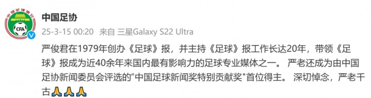 2025-03-15 04:15:53中國足協發文悼念《足球》報創刊人嚴俊君:深切悼念,嚴老千古