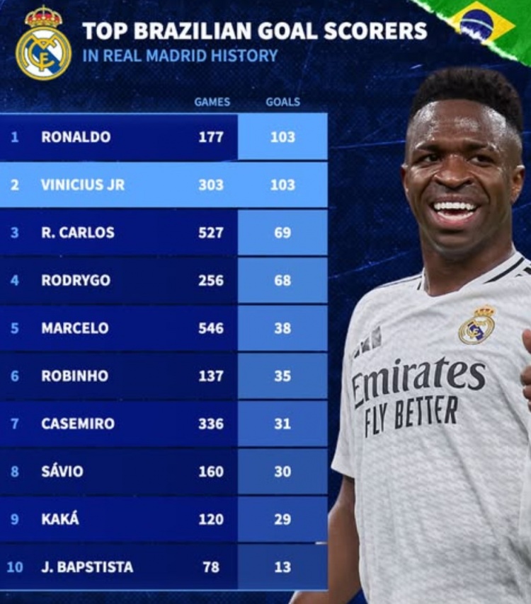2025-03-16 16:18:51德轉(zhuǎn)列皇馬巴西射手榜:大羅&維尼修斯103球,卡洛斯、卡卡在列