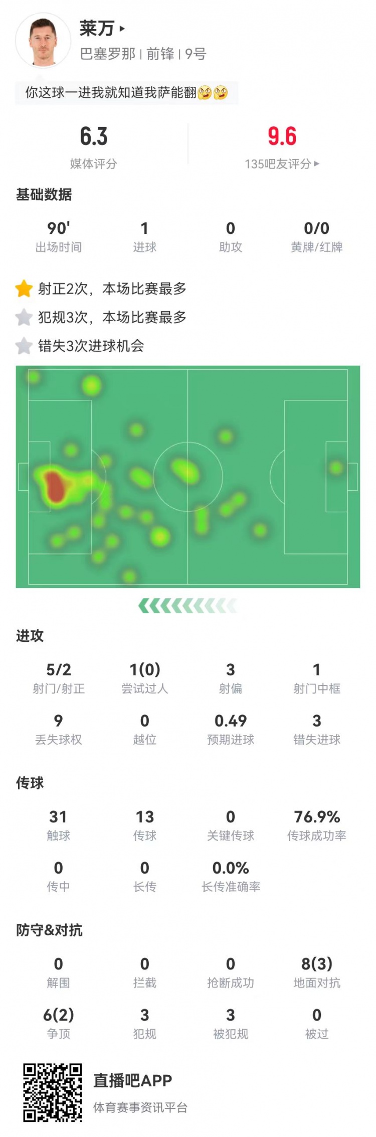 2025-03-17 07:09:26萊萬本場5射2正 1球3失良機 14對抗5成功 3犯規3造犯規 僅獲6.3分