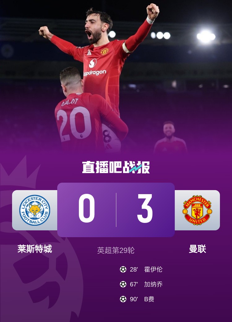 B費1射2傳,加納喬建功。最終曼聯客場3-0完勝萊斯特城,紅魔賽季4殺萊斯特。