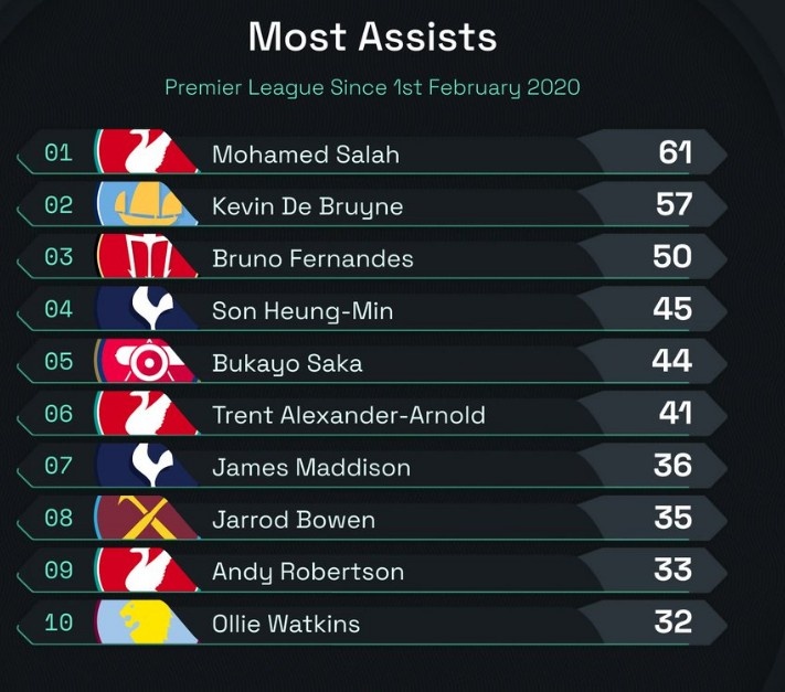 2025-03-17 07:11:18自B費首秀以來英超助攻榜:B費50次第三,僅次于薩拉赫&德布勞內