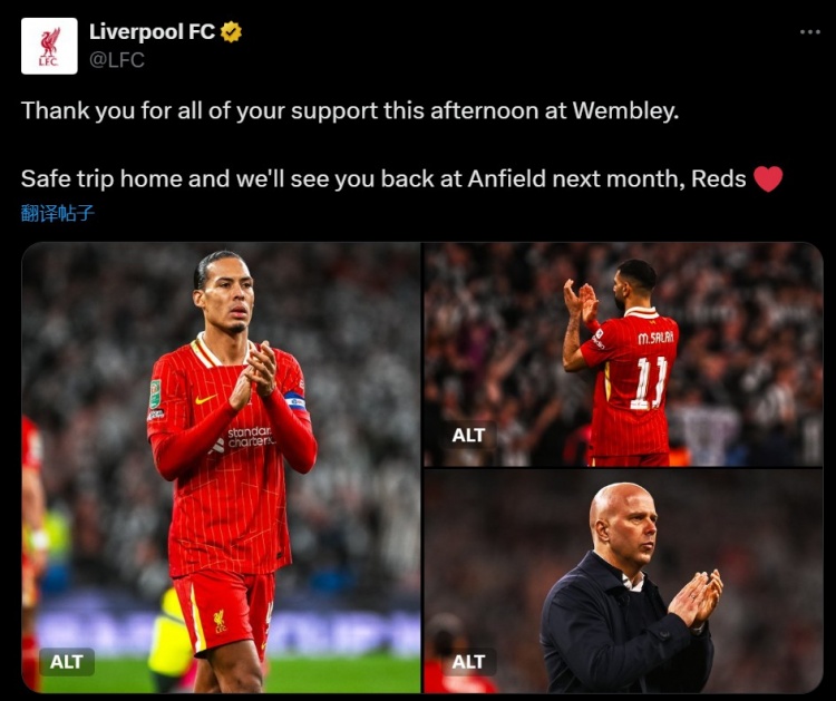2025-03-17 07:13:30利物浦官推:感謝球迷們的支持,我們下個月安菲爾德再見