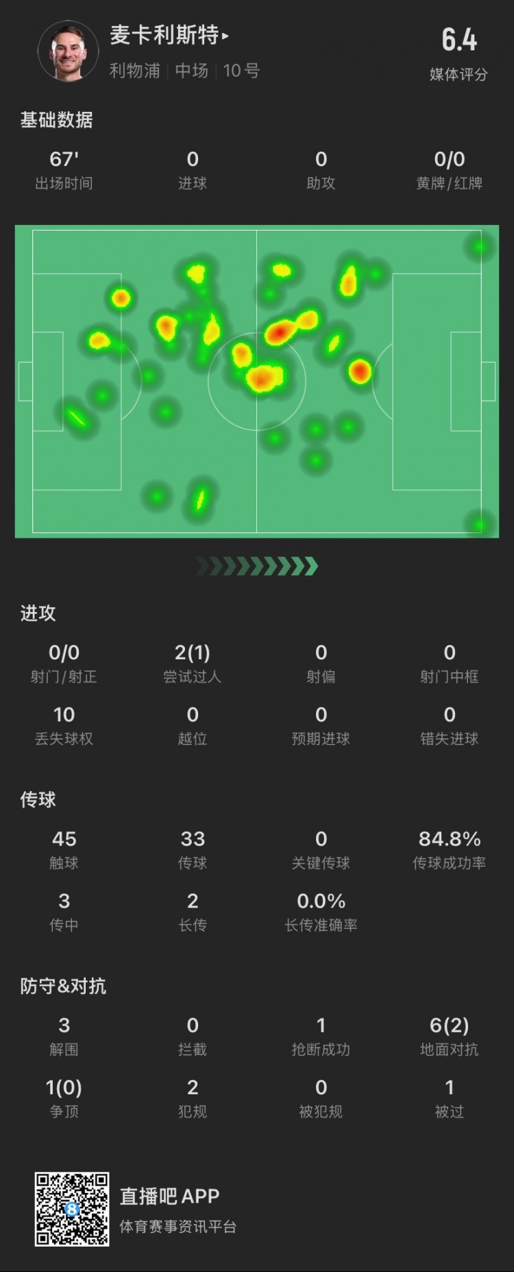 2025-03-17 07:15:05麥卡本場:7次對抗成功2次,貢獻3解圍1搶斷,2犯規,僅獲評6.4分