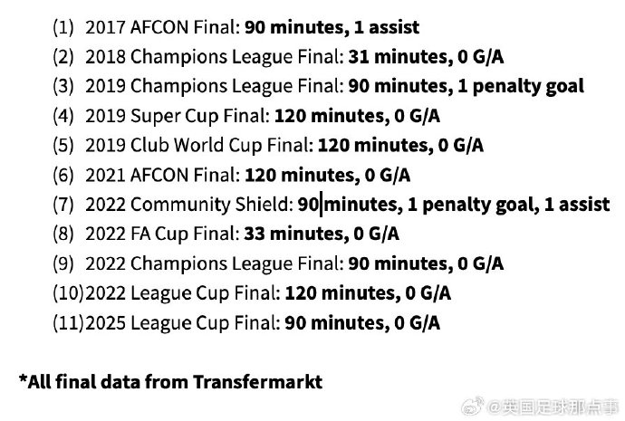 2025-03-17 16:08:57薩拉赫至今代表俱樂部和國家隊參加11場決賽,從未打入非點球進球
