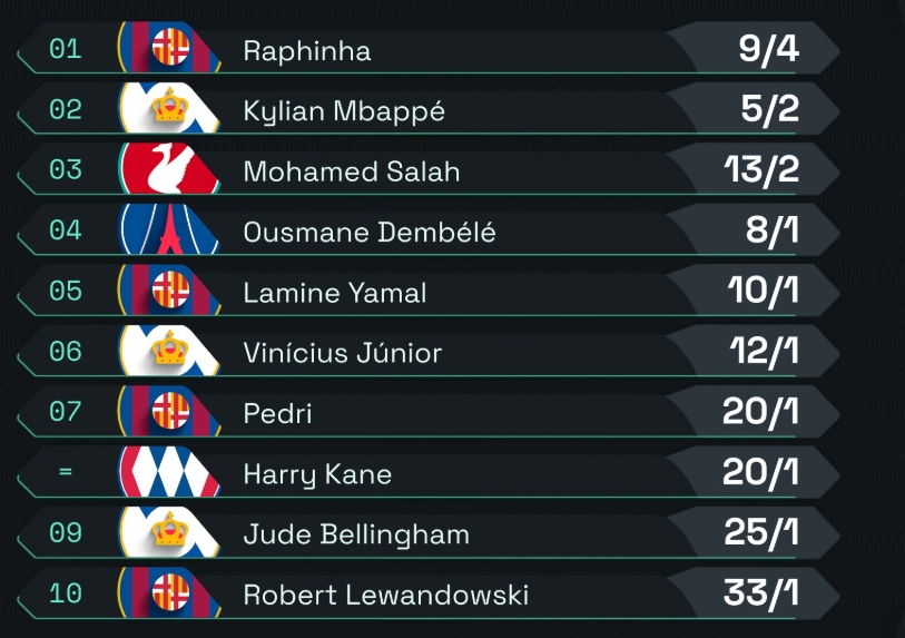 2025-03-18 08:07:15金球獎賠率:拉菲尼亞居首、姆巴佩第二,皇薩球員7人進前十