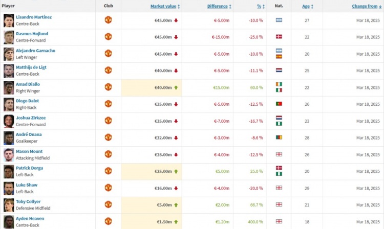 2025-03-18 21:03:04曼聯身價更新:霍伊倫下跌1500萬歐,阿瑪德上漲1500萬歐