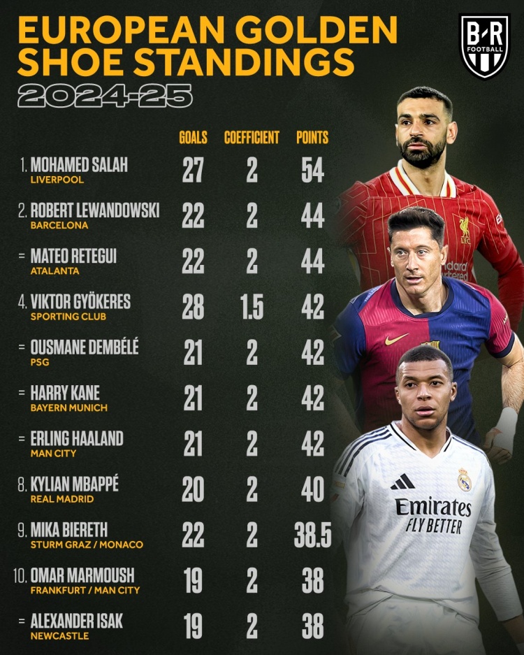 2025-03-18 21:08:19本賽季歐洲金靴排名:薩拉赫54分領(lǐng)跑,萊萬(wàn)、雷特吉44分次席