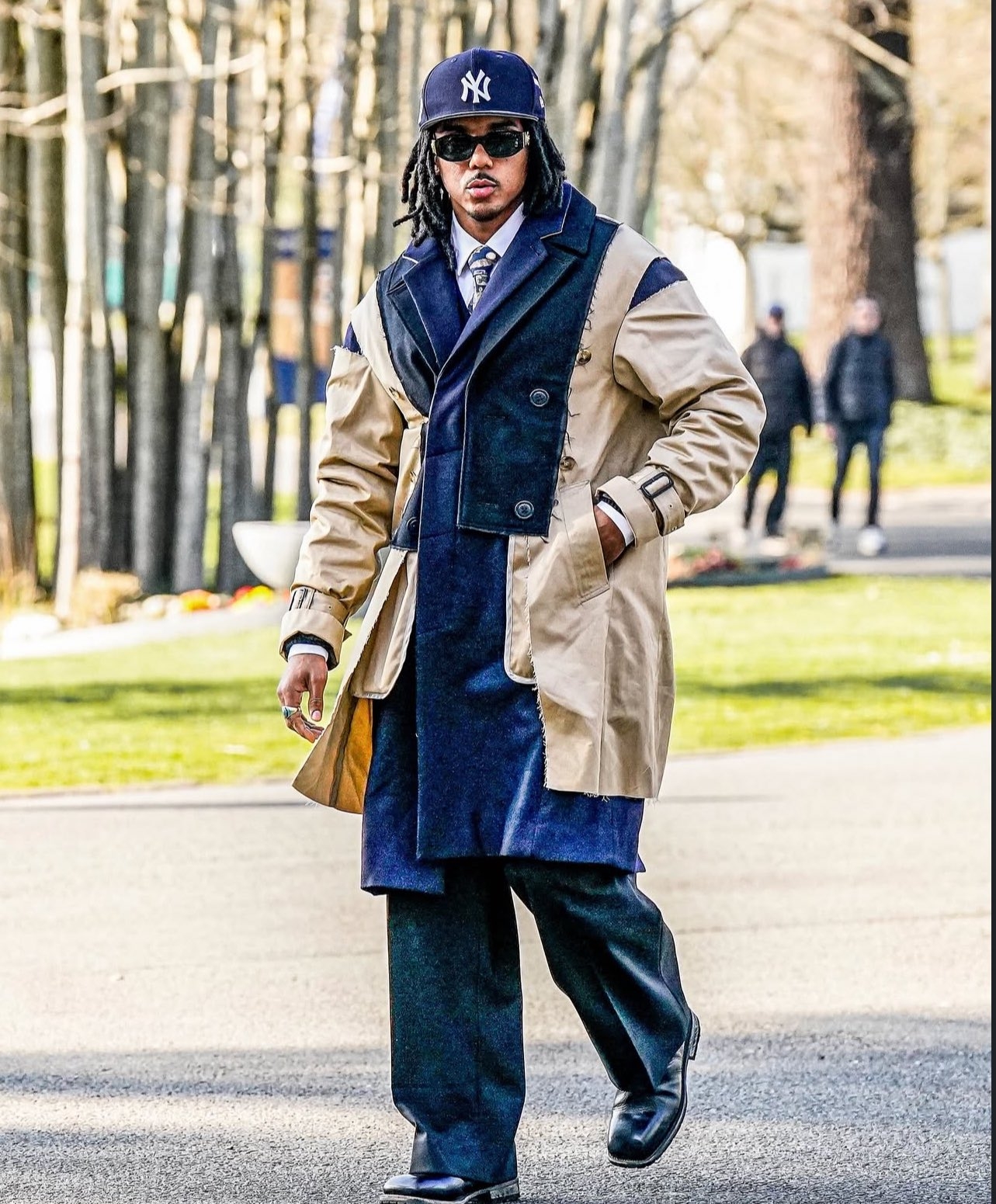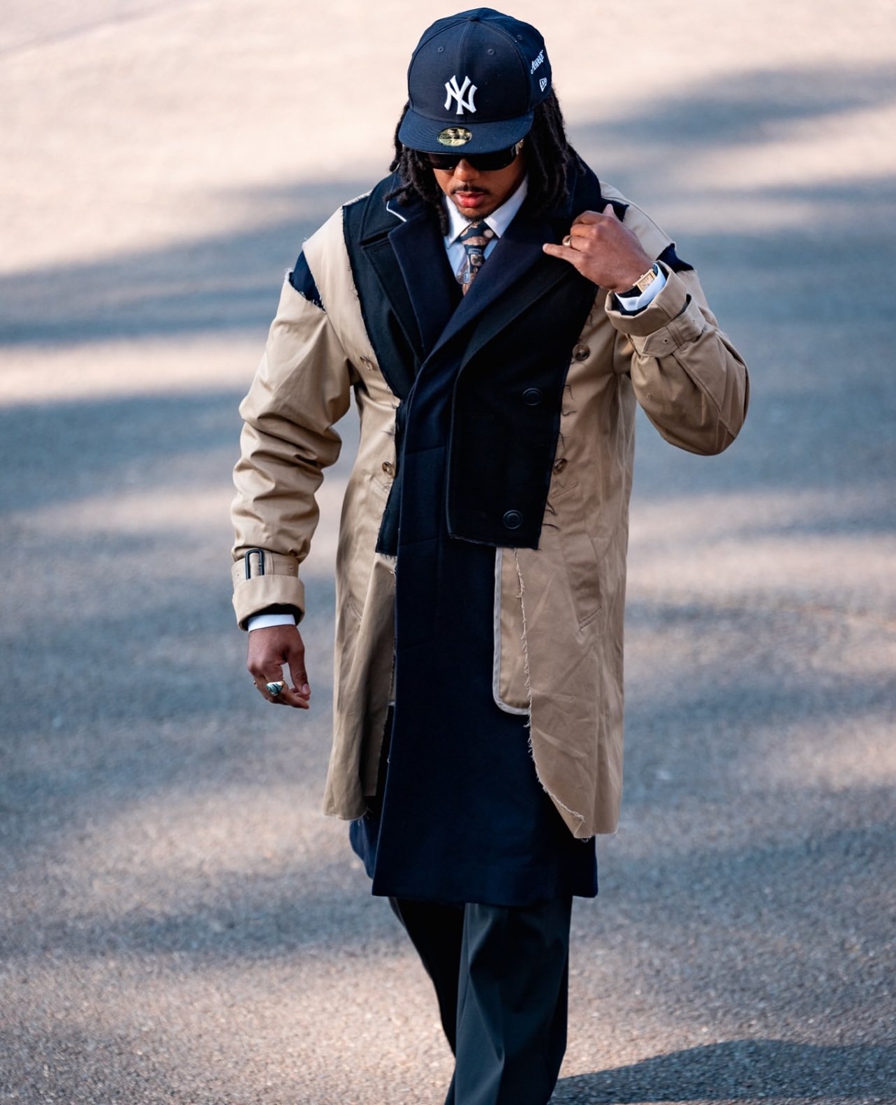 這一次孔德的穿搭中,最引人注目的就是他身上的拼接外套,這件大衣來自日本小眾設計師品牌FACETASM,是2022-23的秋冬系列中的一件。