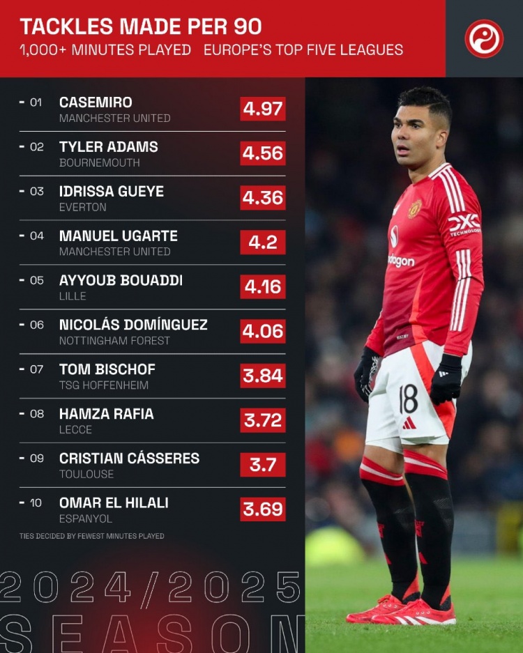 2025-03-19 16:38:37五大聯賽每90分鐘搶斷榜:卡塞米羅居首,亞當斯、蓋耶二三位