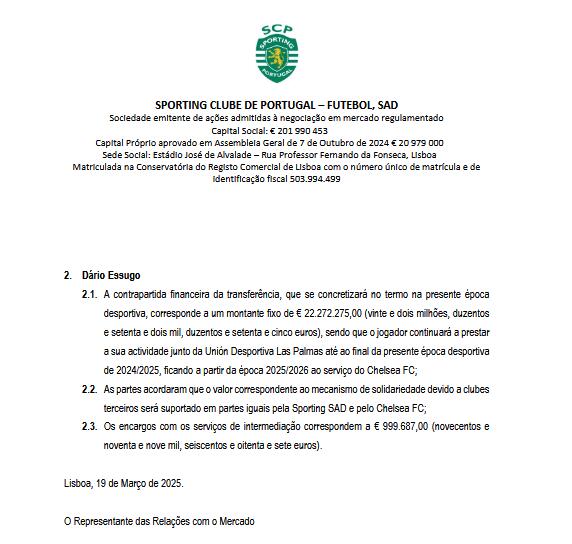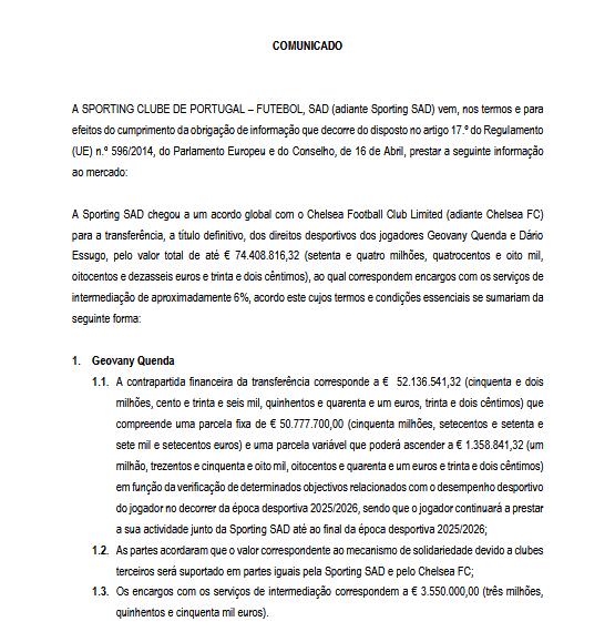 葡體與切爾西就球員昆達和埃蘇戈的永久轉會達成全面協議,總金額為74408816.32歐元(約7441萬歐),其中包括約6%的中介服務費用。