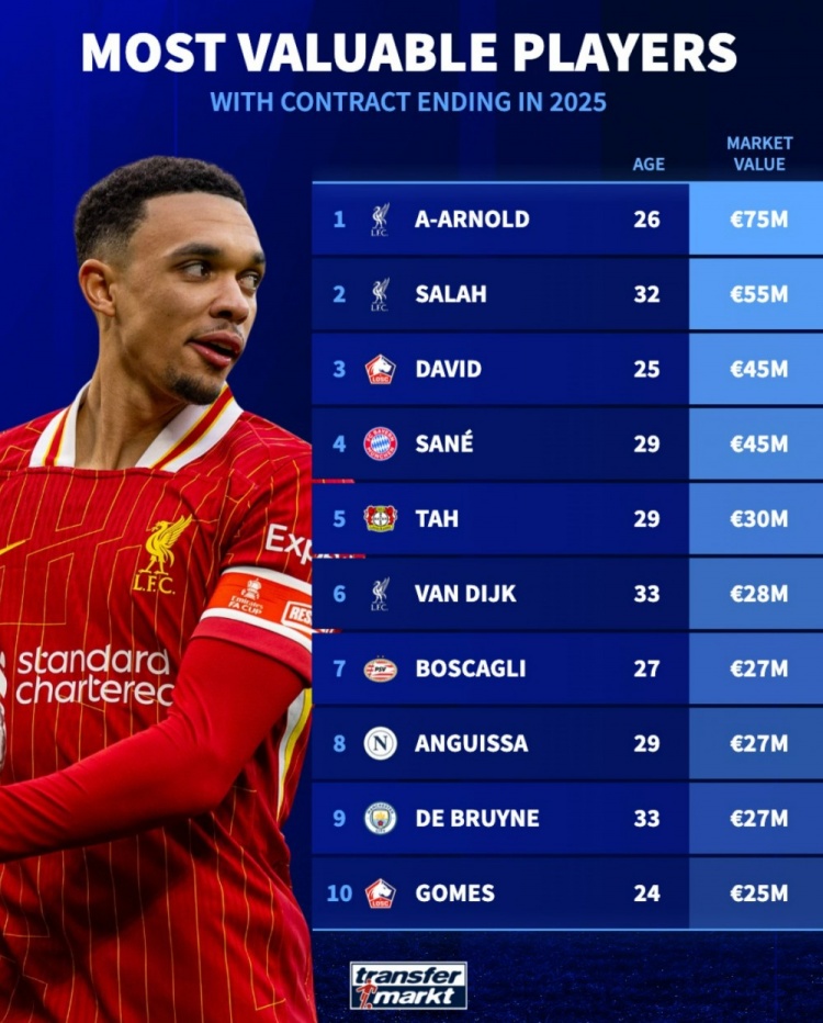 2025-03-20 22:53:17德轉列合同年球員身價榜:阿諾德居首,薩拉赫次席,薩內在列