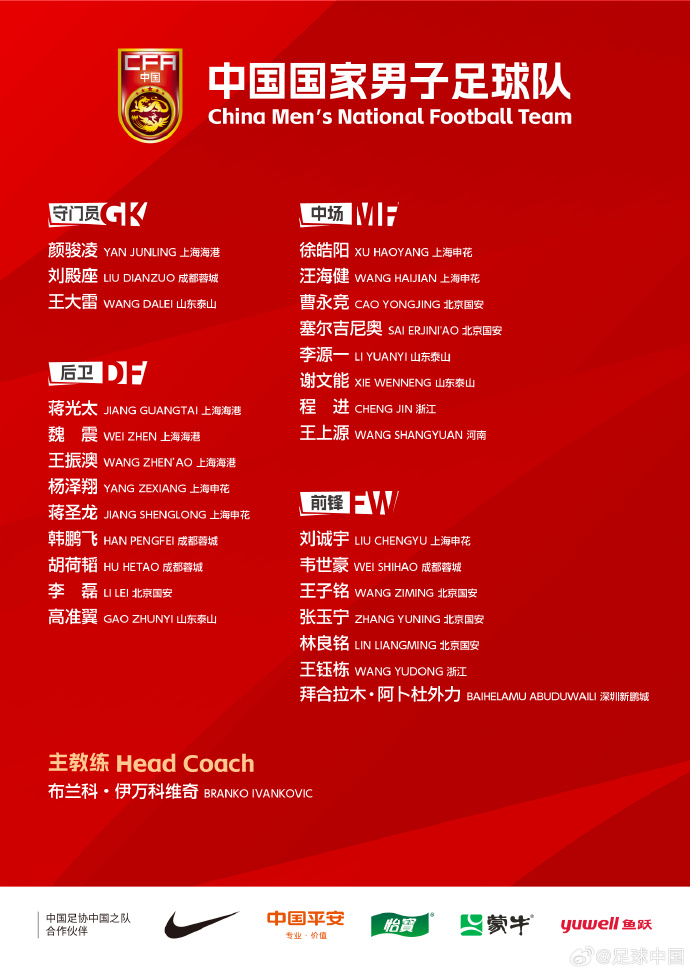 規則規定,中國隊本場比賽至多報名23名人。從相關訊息渠道獲知,根據球隊的訓練情況,落選球隊本場比賽報名陣容的4名球員分別是來自國青前鋒王鈺棟、劉誠宇、中場球員程進、邊后衛王振澳,歸化新人塞爾吉尼奧確定入選。