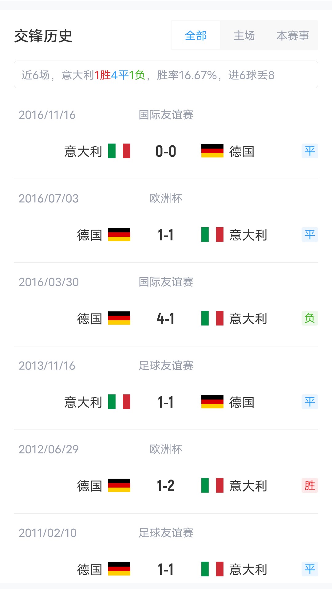 在歐國(guó)聯(lián)小組賽中,意大利排名B組第2,德國(guó)排名C組第1;雙方近6場(chǎng)直接對(duì)話(huà)中,意大利取得了1勝4平1負(fù)的戰(zhàn)績(jī)。兩隊(duì)最近一次交手,是在2016年11月16日,友誼賽意大利0-0戰(zhàn)平德國(guó)。