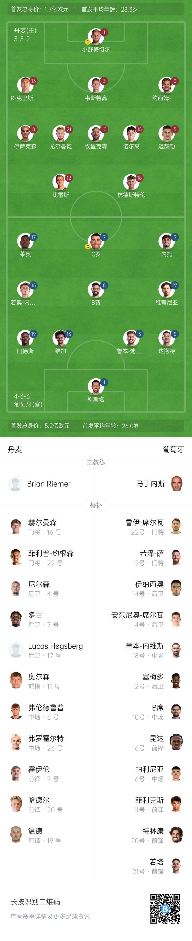 3月21日訊 北京時間03:45,歐國聯1/4賽決賽首回合,葡萄牙客場挑戰丹麥。賽前官方公布了雙方的首發名單。