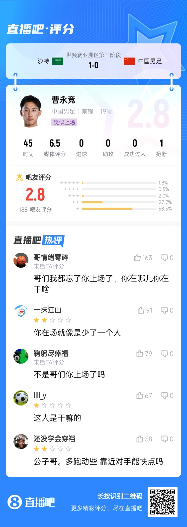 2025-03-21 20:00:11中場成短板!國足菱形中場評分普遍低迷,吧友:韋世豪踢不了10號