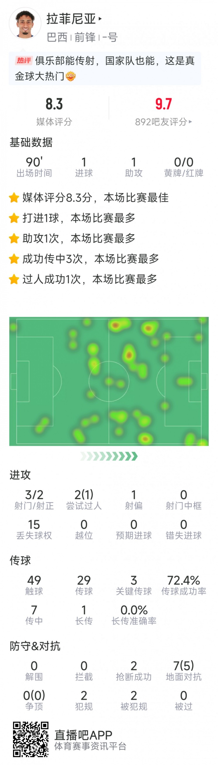 2025-03-21 20:04:52拉菲尼亞本場數據:傳射建功,3次關鍵傳球,3射2正,2次搶斷
