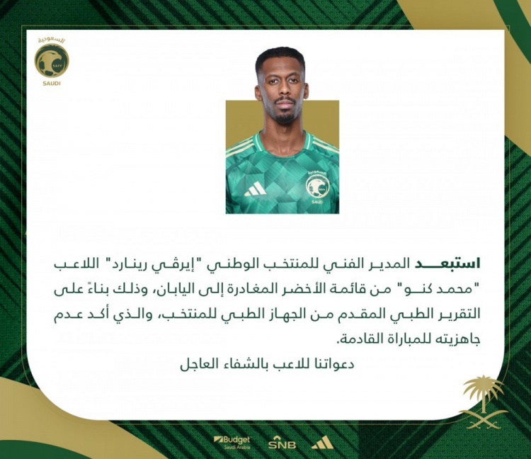 2025-03-21 20:16:10官方:穆罕默德-卡努因傷退出沙特隊本期名單