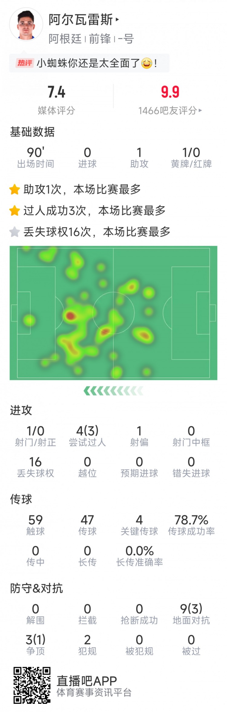 2025-03-22 16:16:24阿爾瓦雷斯本場數據:1次助攻,4次關鍵傳球,3次成功過人