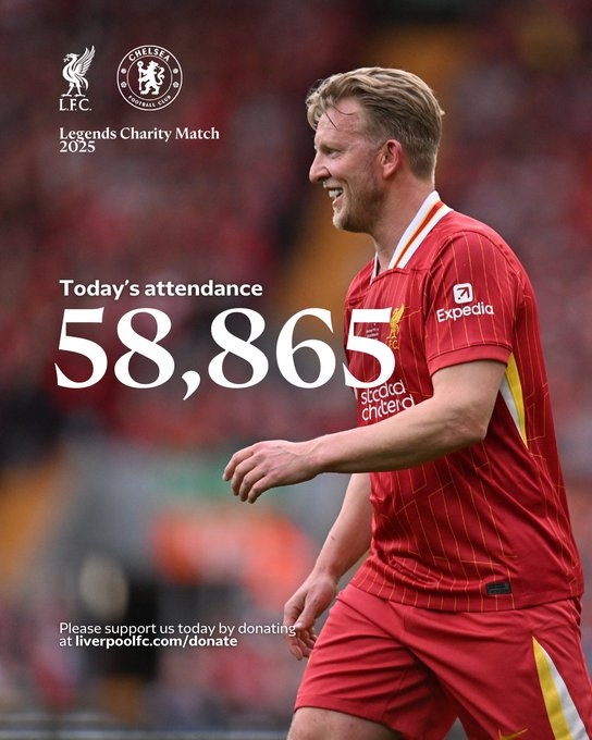 2025-03-23 03:16:56捧場!利物浦vs切爾西傳奇慈善賽現場共計有58865名觀眾