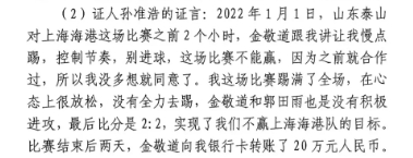 證言中,孫準浩表示在泰山2-2平海港之前,金敬道說讓慢點踢這場不能贏。賽后,金敬道給孫準浩20萬人民幣;在2-0河北之前,孫準浩跟著金敬道下注50萬,這場比賽結束后金敬道把錢給金敬道姐姐郭今蘭,郭今蘭再給孫準浩的哥哥。