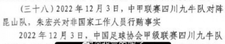 2022年12月3日,中甲聯(lián)賽四川九牛隊對陣?yán)ド疥牐旌昱d對非國家工作人員行賄事實。