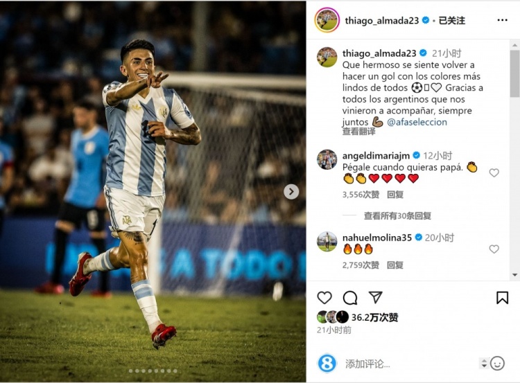 2025-03-23 15:08:04阿爾馬達社媒慶祝進球,迪馬利亞留言:隨時轟一腳吧!