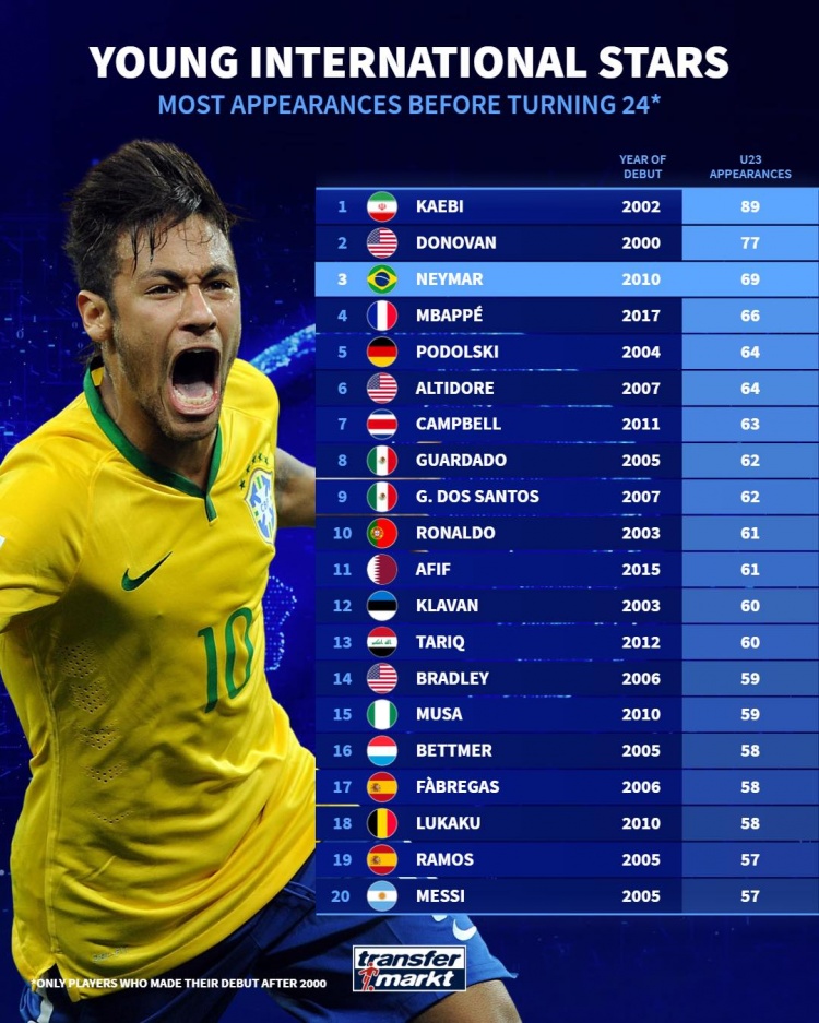 3月23日訊 德國轉會市場統計球員24歲之前在國家隊的出場次數,并列出榜單,內馬爾69場排名第三位,C羅61場,梅西57場。