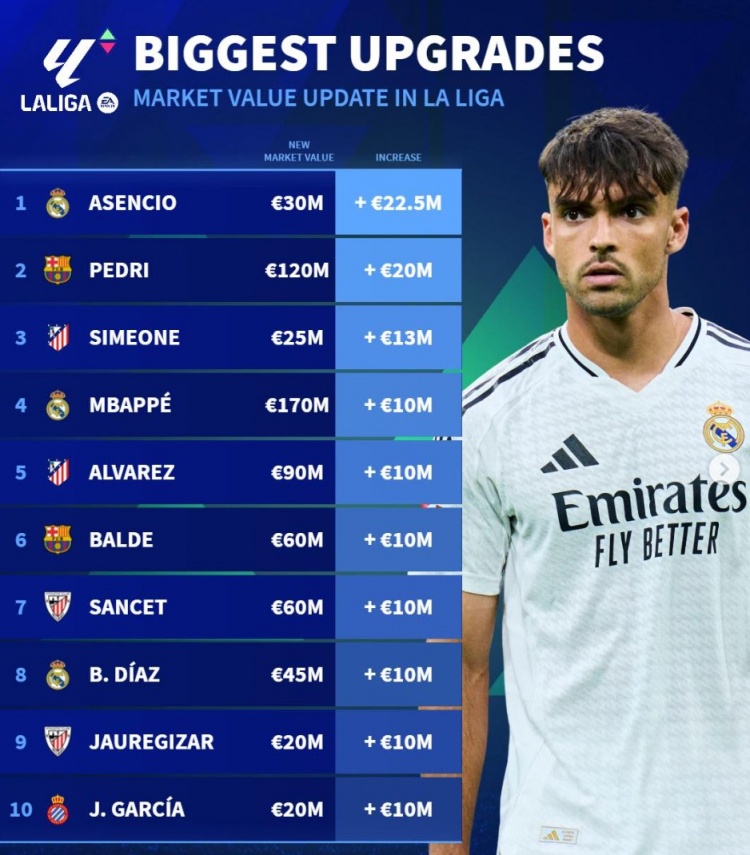 2025-03-24 19:25:40西甲身價升值榜:勞爾-阿森西奧、佩德里領銜 姆巴佩、小蜘蛛在列