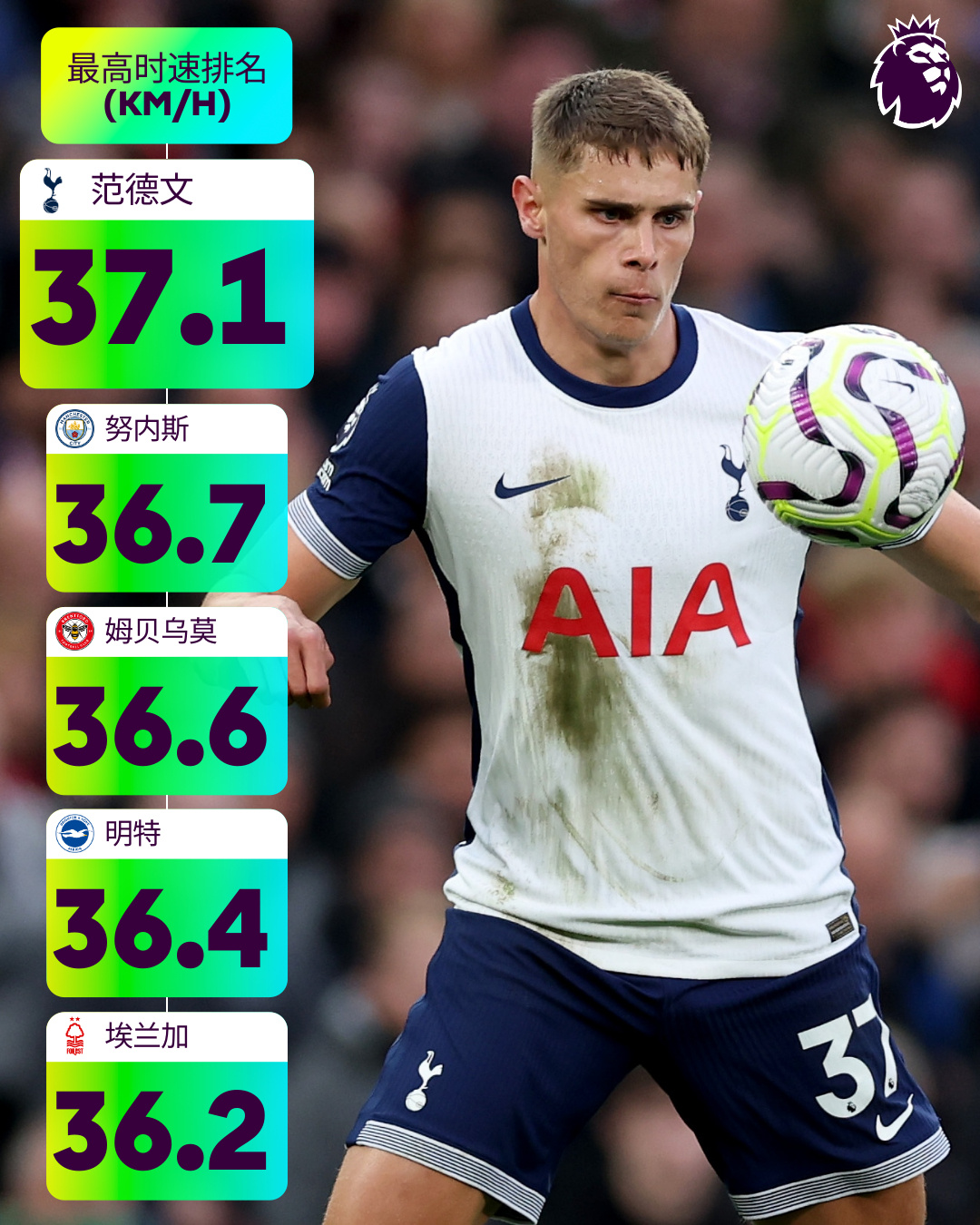 2025-03-26 20:20:12本賽季英超至今球員最高時速:范德文領跑,努內斯、姆貝莫二三