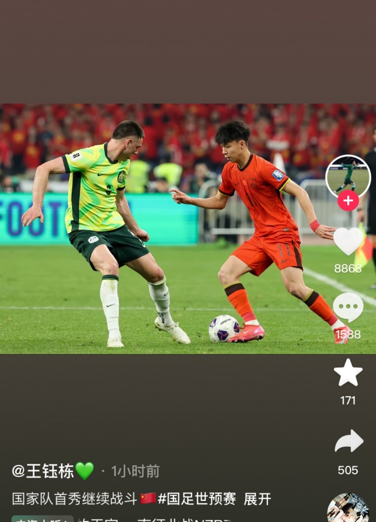 2025-03-26 20:25:55王鈺棟社媒曬國足首秀照,蒯紀聞留言:太愛你了兄弟