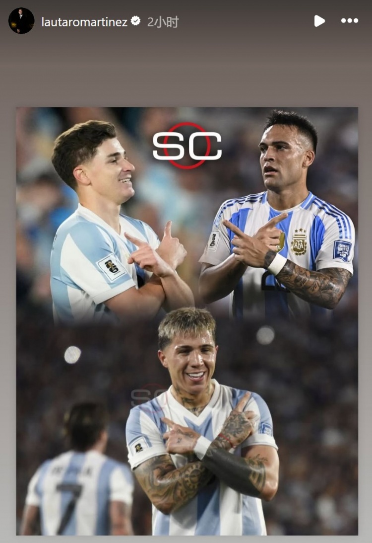 2025-03-26 20:27:24阿爾瓦雷斯&恩佐模仿勞塔羅慶祝動作,后者社媒轉發三人照片