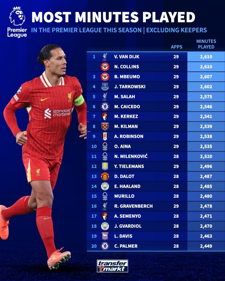 2025-03-27 08:41:41英超外場球員出場榜:范迪克打滿29場居首,薩拉赫第5、凱塞多第6