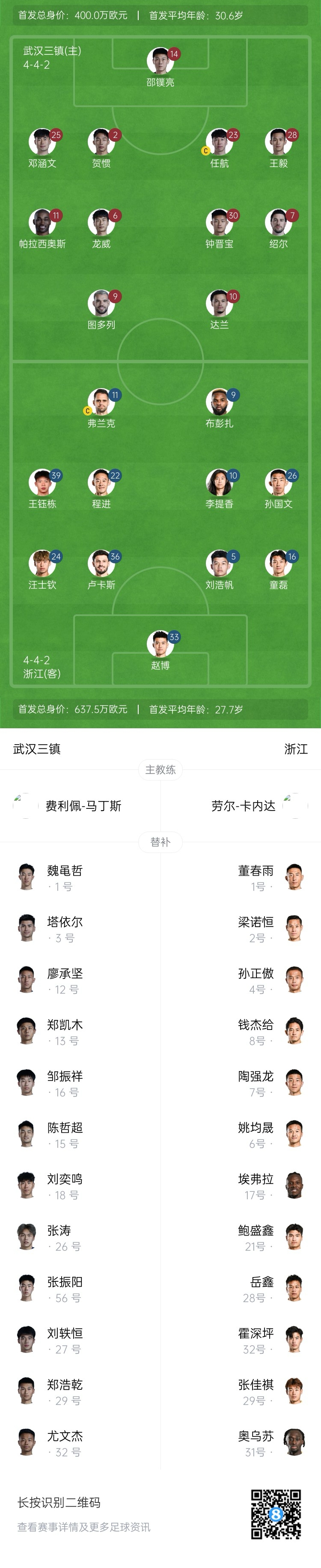 03月28日訊 北京時間19:35,中超第3輪,武漢三鎮vs浙江隊,賽前雙方首發公布。