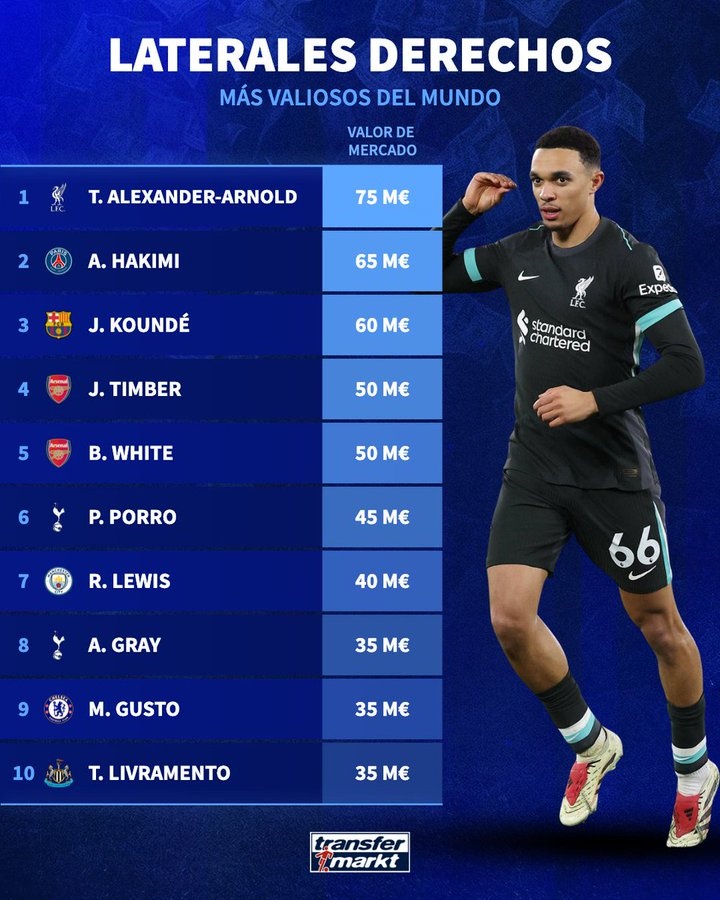 2025-03-28 19:23:42皇馬又免簽了個硬菜?德轉列右后衛身價:阿諾德7500萬歐居首