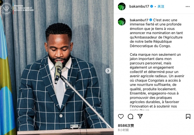 2025-03-28 19:33:00巴坎布曬就任民主剛果農(nóng)業(yè)大使照:讓我們共同助力農(nóng)業(yè)可持續(xù)發(fā)展