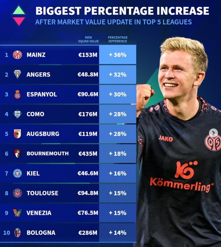 2025-03-28 19:35:31五大聯賽球隊身價升值比例:美因茨漲36%,博洛尼亞&伯恩茅斯在列