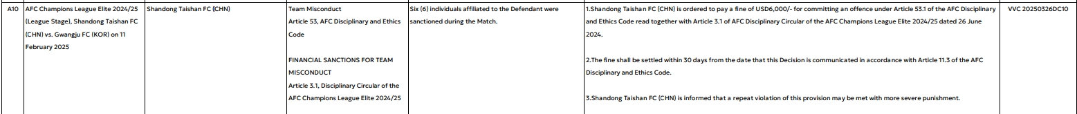 2025-03-28 19:38:01又被罰了!亞足聯官方:泰山對陣光州時6人染黃,罰款6000美元