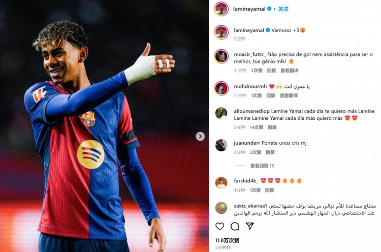 2025-03-28 19:38:46亞馬爾社媒曬照慶祝勝利:讓我們繼續前進!再添三分!