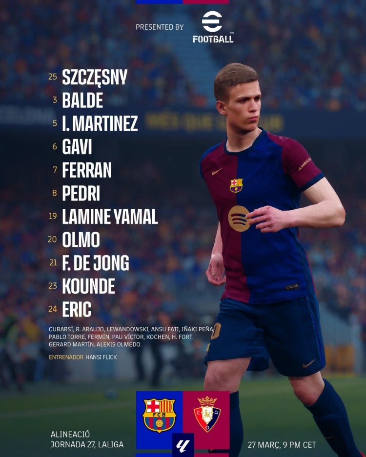 巴薩首發:25-什琴斯尼、23-孔德、24-加西亞、5-伊尼戈、3-巴爾德、8-佩德里、21-德容、6-加維、19-亞馬爾、7-費蘭、20-奧爾莫